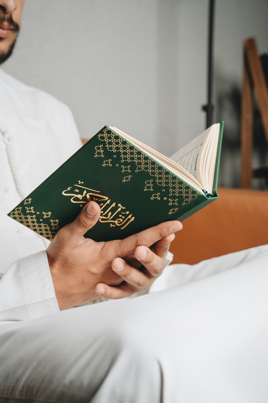 مصحف أنيق بغلاف جلدي فاخر، مثالي للتلاوة اليومية والتدبر خلال شهر رمضان.